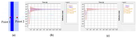 (a) The plan view of the 32m long single-span bridge deck on which the vehicle passageway and points 1 and 2 are shown; (b) time history of the displacement response calculated at points 1 and 2 for the CPGS; (c) time history of the displacement response calculated at points 1 and 2 for the CDLGS.