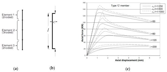 Figure 6a provides the idealizations for each space grid member. The members were defined as a combination of a three-node line-element with the capability of geometric nonlinearity at the middle node along with two linearly elastic beam elements where each end was defined as hinged. The choice of such member modeling was made as a result of a study on the suitability of a number of models [,,]. A practical range of values of the slenderness ratios, were considered (i.e., 50, 80, 120 and 200). Joint flexibility was adopted through []. A Formax [,] approach to sub-structuring, presented in [,] was adopted, which is shown suitable for modular structures, such as the CDLGS. The member’s initial imperfection was modeled through the introduction of the initial eccentricity , shown in Figure 6b. The influence of the eccentricity on the load-displacement response curve of a member is shown in Figure 6c as reference. For this, a bilinear material model along with a damping ratio of 0.04 for the composite steel-concrete constructions under investigation were considered.