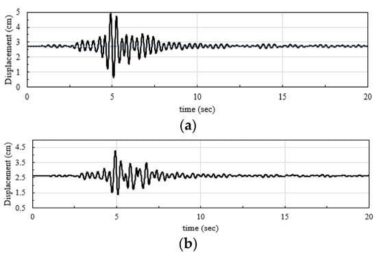 The nonlinear time history analysis results under the action of the vertical component of the Kobe ground motion in terms of the mid-span displacement: (a) CPGS (benchmark); and (b) CDLGS.