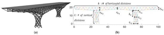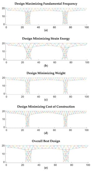 Figure 10 shows the optimal solutions obtained from the NSGA II algorithm for the problem under consideration. Figure 7a shows the resulting design that maximizes the fundamental frequency (without considering the other objectives). Consequentially, Figure 10b–d shows the resulting designs that minimizes strain energy, weight of consumed material, and construction cost. Some visual interpretations of the results were made as follows. The design shape in Figure 10a suggests that the increase in the vertical divisions of the piers, , leads to optimal performance in terms of fundamental frequency. The shape in Figure 10b suggested that the performance in terms of strain energy improved when the number of subdivisions decreased, and the depth variation for both deck and piers increased. The design that minimized the weight (Figure 10c) demonstrated that the increase in the number of horizontal subdivisions while reducing the depth variation, can lead to less material consumption. Figure 10d shows that the length of installed members decreased when the depth variation and horizontal subdivisions increased. These observations also show that one single design cannot satisfy all objectives simultaneously. As such, with the assumption that all objectives have equal importance, the best design was found and shown in Figure 10e. This design has some properties from all the best individual designs, such as decreased depth variation, increased pier width, and so on.