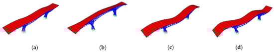 Results of the eigenvalue modal analysis of the best overall bridge for the: (a) 1st; (b) 2nd; (c) 3rd; and (d) 4th mode-shapes.