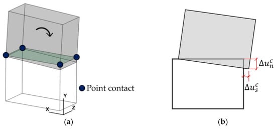 In DEM, the mechanical interaction among the rigid blocks is predicted by calculating the action/reaction forces at the point contacts (also called sub-contacts—see Figure 1a) using three orthogonal springs (one in the normal and the other two in the shear directions). The sub-contacts are defined along the contact plane between the adjacent blocks, and overlapping at the contact points is allowed and controlled by the contact stiffness (: normal contact stiffness, : shear contact stiffness). A typical point contact configuration and the associated contact plane are shown in Figure 1a for a two-block system in which the bottom block is fixed and the top block is subjected to rotation about the z-axis. As mentioned earlier, sub-contact stresses in the normal () and shear () directions are computed based on the relative displacement in the normal and shear directions (, ), respectively, illustrated in Figure 1b.