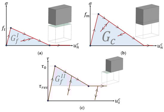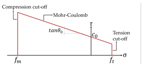 It is worth noting that within the adopted discrete rigid block modelling strategy, the crushing or compression failure of masonry composite and bond tensile and sliding shear failures are all represented at the contact point. The defined failure domain is shown in Figure 3. The shear strength is governed by the Mohr–Coulomb failure criterion (, → compression), whereas tension () and compression cut-off () are used in the normal direction (see Figure 3). A two-way coupling mechanism is considered between tension and shear upon failure in either of them, while one-way coupling is implemented between shear and compression, meaning that compression failure affects the shear capacity; however, shear failure does not influence the compression strength. The readers are referred to the reference study for further details regarding the mathematical and computational procedure of the employed contact constitutive model [].