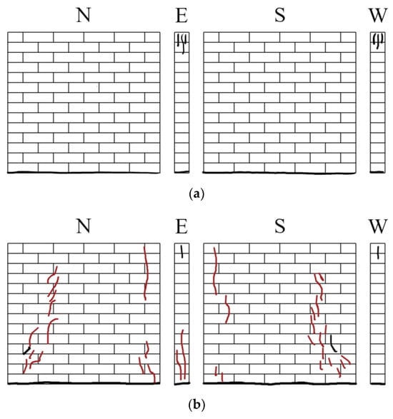 Representation of the crack pattern of URM walls without using DPC: (a) C1, (b) C2, (c) C3—Rocking.