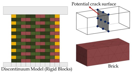 In this study, URM walls are analyzed following the simplified micro-modelling approach based on the discrete element method (DEM) developed by Cundall []. The discontinuous nature of URM walls is represented within the DEM framework, where each masonry unit is denoted by two rigid blocks with a potential crack surface, whereas the bond (or unit–mortar interface) is explicitly considered using zero-thickness interfaces. Note that the adopted modelling strategy may also be denoted as discrete rigid block analysis (D-RBA), and various applications of D-RBA can be found in the literature (e.g., []).