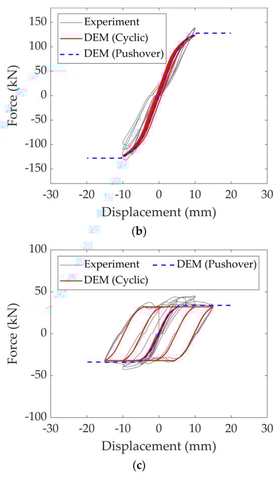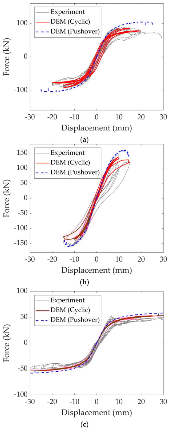 Next, the URM walls with DPC membranes are analyzed. To represent the DPC membrane, the mechanical properties between the bottom course layer of masonry and the support block are modified. A lower bond strength and sliding resistance at the contact points are considered by utilizing a lower friction angle () in line with the available studies []. The results of the computational investigations (including monotonic and cyclic loading) are presented in Figure 10 and compared against the experimental results. Other than the high pre-compression load (B2—Figure 10b), the load-carrying capacity of URM panels is underestimated by the adopted discontinuum-based models, as shown in Figure 10a,c. Although a similar trend is predicted through DEM-based simulations in unloading–reloading cycles for B1 and B3, the ultimate lateral load is controlled by the sliding resistance of the mortar joints at the bottom course of the URM wall. In line with the predicted hysteric response, the results of the pushover analyses (monotonic loading) provide an identical failure mechanism, where the maximum lateral load is directly controlled by the sliding capacity, yielding an elastic–perfectly plastic response which are also depicted in the presented force–displacement curves (see Figure 10). The associated failure mechanisms of the analyzed URM walls are given in Appendix A, where the readers can find the computed damage states at the contact points for all three pre-compression loads. As mentioned earlier, the dominant mechanism, predicted as a sliding failure, can be noticed at the bed joints for pushover and cyclic loading, illustrated in Figure A1 and Figure A2, respectively. Since no significant difference is noted in the obtained damage patterns (from both monotonic and cyclic loading), the results are provided in Appendix A. While most of the presented observations, based on the outcomes of the computational models, are in good agreement with the experimental observations, crushing failure is noted during the experiment with high pre-compression pressure (B2) instead of sliding failure. This discrepancy may come from the obtained premature sliding failure mechanism preventing the rocking and eventual crushing failure of masonry in the numerical model. Moreover, the adopted modelling approach does not address the material uncertainty, providing a limited perspective to capture different failure modes under identical loading and boundary conditions.
