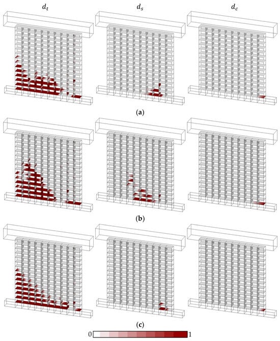 Predicted damage pattern from discontinuum-based analysis of URM walls with DPC membranes under cyclic lateral loading: (a) B1, (b) B2 and (c) B3—No damage: 0, Full damage: 1.