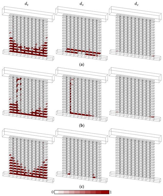 Predicted damage pattern from discontinuum-based analysis of URM walls with DPC membrane under monotonic lateral loading (pushover): (a) B1, (b) B2 and (c) B3—No damage: 0, Full damage: 1.