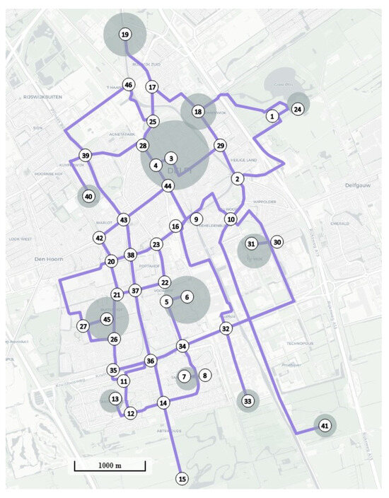 The application of the RNDP-AVs model is exemplified in a quasi-real case study: the city of Delft, in the Netherlands, located in the province of South Holland. Figure 1 shows all nodes (46) and road links (122) in the simplified network of Delft in a map of the region. The city centre is represented by node 3 and has the highest demand. The TU Delft campus is node 31, and major residential areas are in nodes 6 and 45. Two types of roads exist, one or two lanes per road direction, with a lane capacity of 1441 vehicles per hour, and the free flow speed is 50 and 70 km/h, respectively. These data come from a simplified traffic model of the city [8]. The application is for demonstration purposes, and the intention is to exemplify what type of results could be obtained from planning such networks.