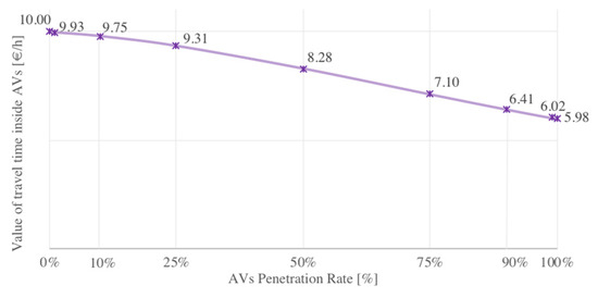 The reference value of travel time spent inside CVs () in commuter trips in the Netherlands is considered to be EUR 10 per hour [29]. Since the total flow is a single variable and the cost function depends on the weights given to the variables, the AVs’ value of travel time is proportionally reduced in mixed and dedicated roads. Bearing in mind the inevitable mathematical incoherence mentioned in Section 2, we make use of this incoherence as the AV value of travel time decreases in an inversely proportional way to the road capacity gain that is given by the AVs. The AVs’ estimated values of travel time in the existing literature could drop as far as EUR 5.50 in the Netherlands for commuter trips [29]. In our experiment, CV passengers always have a higher value of travel time (10 EUR/h), whereas AV passengers have a reduced travel time cost. In dedicated roads, all traffic is automated, so the value of AVs’ travel time is EUR 5.95 per hour (). In regular roads with mixed traffic, the value of AVs’ travel time () varies accordingly to Figure 2.