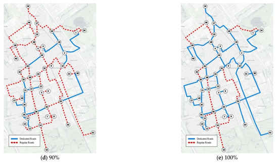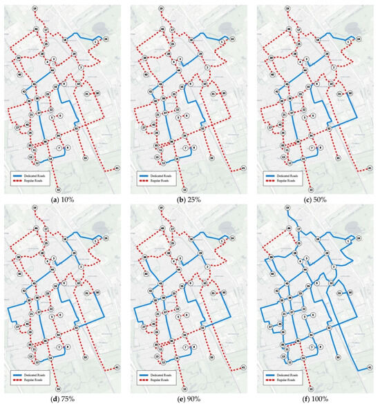 The strategy considered for the selection of dedicated roads is debatable and dependent on the desired results. Two patterns are noticeable: When most of the vehicles are conventional, the model aims to reduce CV detouring costs by selecting dedicated roads with a lower capacity and therefore lower speed, moving AV traffic away from regular roads. As more AVs are present in the system, the model aims to increase their cost savings by increasing the subnetwork’s dimensions. The expansion of the AVs subnetwork is condensed in Figure 19. The pink area considers the optimality of the peak-hour design.