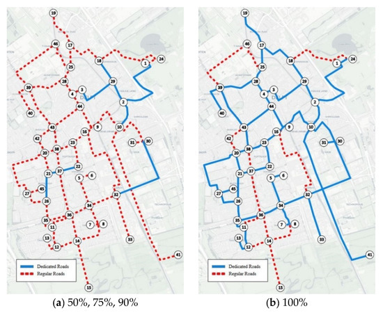 Currently, most of the literature on network design is focused on dedicated lanes to first deploy AVs in urban environments [16,17]. On the topic of dedicated roads and AV subnetworks, ref. [18] proposed a bi-level framework for the optimal design of AV subnetworks, solved through a simulated annealing algorithm. However, their equilibrium analysis ignores CV trips that start and end inside AV subnetworks for simplification purposes, in a deterministic mixed routing problem that considers a system-optimal traffic assignment inside AV subnetworks and user equilibrium outside. The authors presented a numerical example where AVs compose 55% of all traffic and found that the social cost can be reduced by up to 21.4%, assuming that the road capacity triples in AV links. Similarly, ref. [19] proposed a bi-level network design model comprising the optimal design of the network involving AV links and congestion pricing to improve congestion. The authors use a relaxation-based method for solving the bi-level model. Ref. [20] introduced a bi-level problem for optimizing road networks for automated vehicles with dedicated links, dedicated lanes and mixed-traffic subnetworks that has been solved through heuristics.