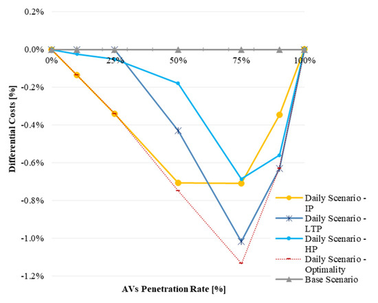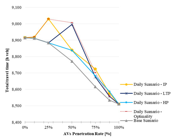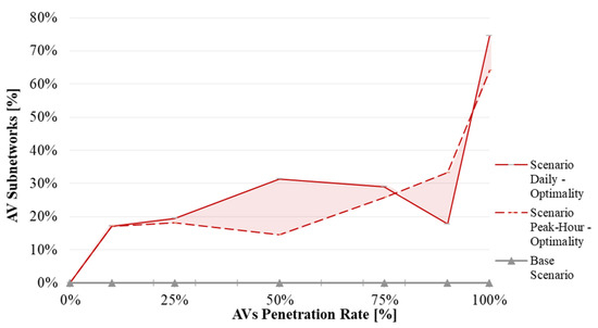 The peak hour is usually considered in traffic design studies as it agglomerates most congestion problems. Therefore, this study was carried out to compare the feasibility on how deep and complex the RNDP-AVs takes place. The optimality of the Daily Scenario is now paralleled with the optimality of the Peak-Hour Scenario (9–10 a.m.) through Figure 18, and given a constant traffic demand throughout the process. The optimal zone (pink shadow) is between both optimality analyses, the Daily and Peak-Hour Designs. From 25% to 75%, the AV subnetworks in the Daily Scenario should be larger than in the Peak-Hour Scenario, whilst in the latest stages (from 90% of AVs onwards), the Peak-Hour Scenario would require larger AV subnetworks.