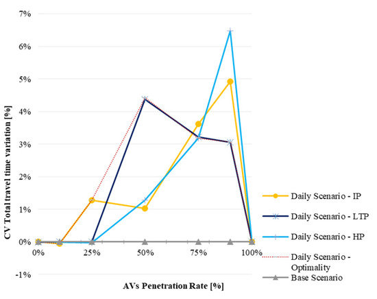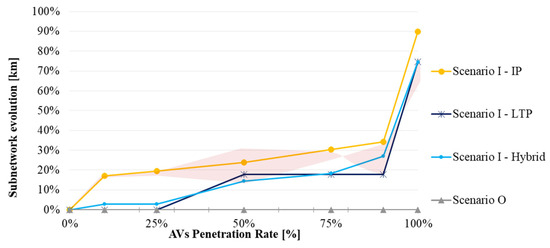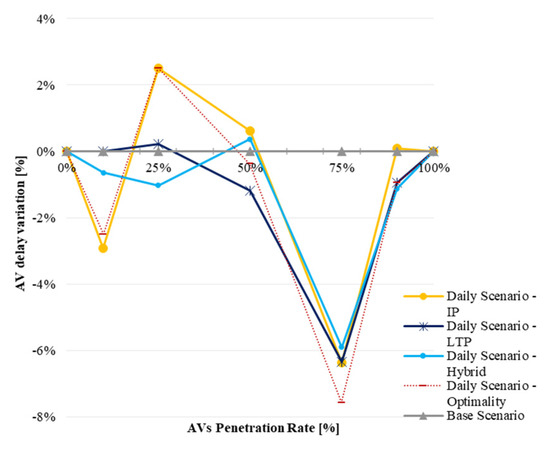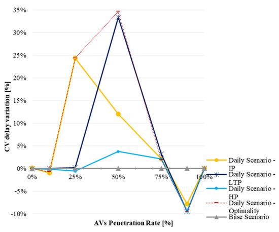 Figure 10 shows that CV detouring is unavoidable in the latest stages, increasing up to 10%. The “best” strategy to avoid CV detouring is the IP, if the design starts at a penetration rate of 25%. If the design starts at 50%, the outcome would be the optimality, which is not so beneficial. In addition, the IP strategy searches for shorter AV routes (Figure 11), which, while causing higher travel times, means that the IP design starts selecting lower-capacity roads. The IP design can increase the total delay of CV passengers (Figure 12) by about 25%. The LTP increases CV total delay to 35% for an AV penetration rate of 50%. The HP mitigates CV total delay and, for this indicator, is considered the “best” strategy. Similar conclusions can be drawn for AVs (Figure 13): the hybrid and the LTP strategies reduce delay up to 8%. AV subnetworks are important for reducing AV delays.