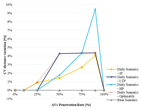- CVs experience detouring away from AV subnetworks to reach their destination, which is depicted by an increase in CVs’ distance (see Figure 10). This occurs, for instance, at a penetration rate of 75%.