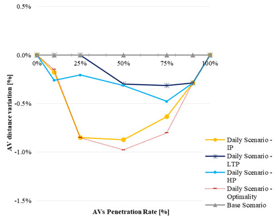 - AV trips might occur on shorter routes (lower distances) and experience higher travel times (Figure 11) This happens if AV subnetworks include roads with lower capacity/speed, when both AV delays and distance decrease. For example, this happens at a penetration rate of 10% in the IP and HP and of 50% in the LTP.