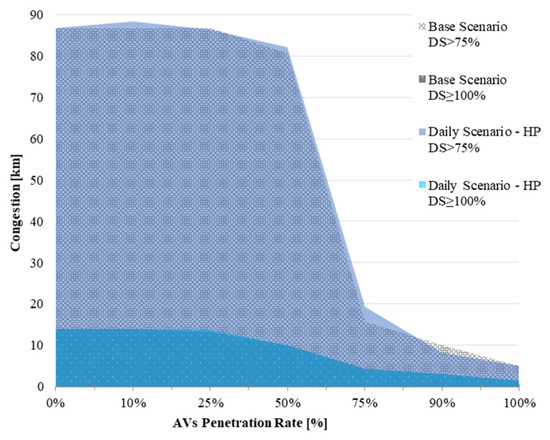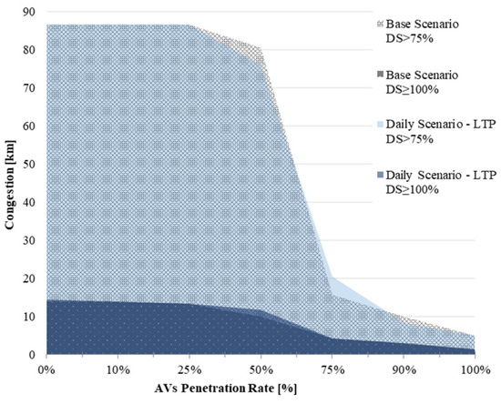 Figure 14, Figure 15, Figure 16 and Figure 17 evaluate congestion behaviour during this process. Figure 14 illustrates the average degree of saturation, which indicates that speed might increase on some roads. The IP design presents on average a lower degree of saturation; in Figure 15, for an AV penetration rate of 50%, the length of congested roads (DS ≥ 100%) is higher (8.14 km) than the Base Scenario—meaning that AV subnetworks from IP are not suitable at this design stage. The LTP (Figure 16) is suitable for an AV penetration rate of 50%, decreasing congestion on roads above practical capacity (DS ≥ 75%) on 4.60 km, yet worsening congested roads (DS ≥ 100%) on 1.77 km. HP (Figure 17) has a similar performance as the LTP, showing low performance in most of the transition process. Overall, AV subnetworks do not improve/mitigate congestion significantly, since the efficiency of AVs has an equally significant role in congestion in the Base Scenario.