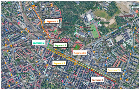 - Segment 4: It is 370 m in length and is composed of a shared bicycle–bus lane. This lane is not separated from vehicle traffic. It is also not designated and marked as a bicycle lane, but it is open to bicycles, motorcycles, E-scooters, and bus travel.
