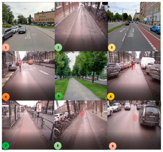 - Facility Features: The facility is an essential network for meeting road users’ needs. The facility types used by cyclists such as bike lanes, bike paths, shared use paths, significantly affect safety. The bike path is commonly considered the safest depending on the degree of separation [19], while bicycle lanes tend to have less severe accidents than shared-use paths [20]. The highest danger index by facility type is 4.49 for off-road/unpaved paths and 1.39 for multiuse paths [21]. Excessive access points such as intersections, other roads, parking, etc. can increase the likelihood of bicycle accidents, especially on two-way bicycle facilities. The highest number of bicycle accidents is related to facility features and is due to collisions with other road users (more than 65%) [21,22]. Also, the presence of fixed and non-fixed obstacles such as street furniture (benches, bins, poles, signs, barriers, fountains, bus/tram stops), trees, parked cars, door cars, etc., may lead cyclists to collide with them and endanger themselves or have accidents. A total of 24% of cyclists have collided with obstacles and been injured [23], and on-street parked vehicles increase the likelihood of bicycle accidents and conflict due to car doors opening into cyclists’ paths [24]. Safety protective barriers play a crucial role in preventing injuries in any event of hazard such as a run-off road vehicle accident. For example, in the event of an accident, the barriers along the roadway can absorb the kinetic energy of the vehicle by deforming over a certain distance. Therefore, this will considerably reduce the severity of accidents and run-off-road accidents [25]. A total of 55% of the cyclists who participated in the experiments chose an off-road without safety barriers as presenting a higher accident risk [4].
