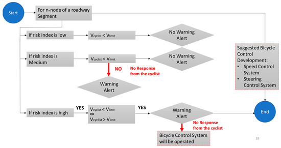 - Applications for Automotive Tools: The proposed risk index can also serve as a foundation for the development of automotive tools designed to mitigate different types of accident occurrences or reduce the severity of injuries. Furthermore, this risk index leads to the development of a real-time alert system for cyclists, warning them of the risks associated with certain areas of the road segment, based on their current speed. Warning cyclists of the risks associated with riding a bicycle on a road segment will help prevent future traffic accidents as cyclists will react properly in advance. These innovative countermeasures, such as integrating intelligent transportation systems (ITSs) into bicycles will improve the safety of cyclists as vehicle ITSs have succeeded in decreasing road traffic fatalities, particularly among passenger car occupants, in recent years [7].