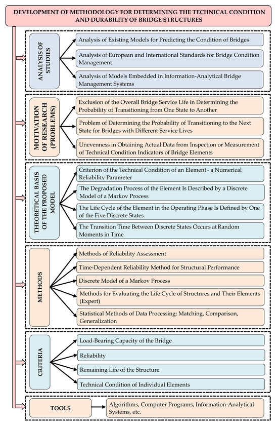 The proposed methodology aims to determine and forecast the technical condition of bridge elements, which could serve as an advanced engineering tool for assessing reliability and durability. It is developed based on fundamental studies that synthesize the experience of studying the physical–mechanical and physical–chemical properties of materials in bridge structures operating under real conditions. The theoretical foundation of the methodology is a reliability model and residual lifetime prediction of bridge elements based on Markov’s theory. The developed methodology is designed for assessing the technical condition of individual bridge elements, followed by a comprehensive evaluation of the entire structure. Reliability during operation is adopted as the indicator of technical condition. This quantitative reliability indicator in the model serves as a criterion for evaluating the safety level of bridge elements; ranking of bridge elements as necessary for specific types of repair, reconstruction, or replacement; strategic planning of expenditures for repair or reconstruction under limited funding; and forecasting the remaining resource of elements. An evaluation and prediction algorithm for the technical condition of bridges is proposed for the application of the developed methodology. A mathematical experiment of the developed methodology was conducted, which confirmed the adequacy of the proposed hypothesis, i.e., the use of the reliability model and the prediction of residual lifetime of bridge elements. First, a three-step mechanism for refining the technical condition of the bridge is proposed, significantly enhancing the accuracy of the calculations. Therefore, the developed methodology holds practical value and can serve as a basis for information-analytical systems for managing the condition of bridges.