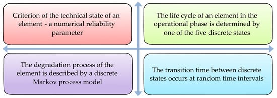 - The process of element degradation throughout the operational life cycle is described by a discrete model of a continuous-time Markov process.