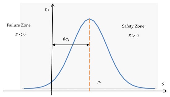 where R denotes the generalized resistance of the element and Q is the generalized load on the element. In most practical tasks, the generalized resistance of the element and the load are considered random variables following a normal distribution. Therefore, according to [,], the strength reserve will also be a random variable, following a normal distribution (Figure 4):
