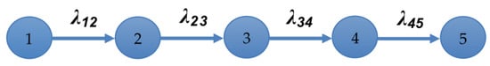 According to this model, the transition time from one state to another occurs at random points in time. The operational states (Table 1) that a structure may be in are adopted as the states of the Markov chain. Let us consider the process graph in the form of Figure 5, where is the density of the flow of random events (transition intensity) that transfers the system from state i to state j.
