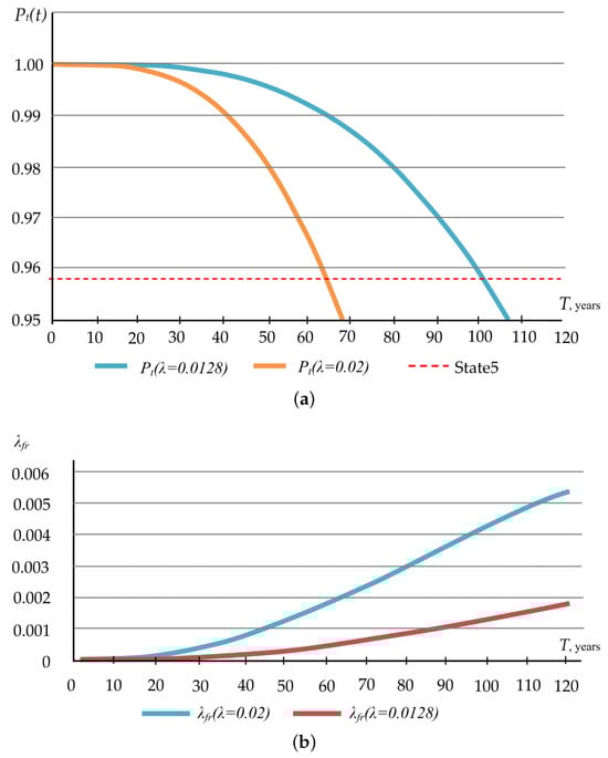 The point of intersection of the line with the curve (31) determines the maximum or critical value of the parameter . Taking into account the condition that the design service life of the bridge is set at 100 years, from Equation (17), the failure rate can be obtained. Therefore, if = 0.0128, the structure will achieve the reliability after 100 years of operation. The actual service life of individual critical elements of the bridge may be around 60–65 years. For such structures, the failure rate will be 0.02. Therefore, for calculations, the values = 0.02 and = 0.0128 were chosen. Then, with the known intensity value , we can determine the service life of the structure T as: