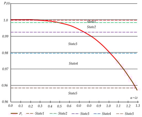 The graph of the function (31) is presented in Figure 7, where the horizontal lines represent the reliability of the structure corresponding to its state according to Table 1.