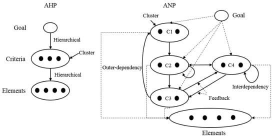 The Analytic Network Process—quite similar to the AHP—was also proposed by Sa-aty [,]. The decision problem, presented in AHP as a hierarchical structure, in fact often has a more complicated structure and includes various types of dependencies between criteria or available options. By using ANP, it is possible to model dependencies and feedback as a kind of a network structure. Still, the priorities are determined using pairwise comparisons, just like in AHP. However, the description of the problem is not a simple top–bottom hierarchical structure, but rather a network with connections between elements on different levels as well as loops within a single element (Figure 2).