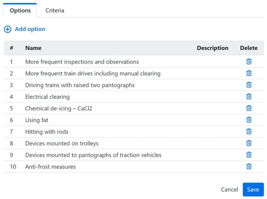 - Baginski, J.; Flisiuk, B.; Górka, W.; Rogowski, D.; Steclik, T. Multi-criteria Decision Analysis in the Railway Risk Management Process. In Proceedings of the Beyond Databases, Architectures and Structures, Paving the Road to Smart Data Processing and Analysis—15th International Conference, BDAS 2019, Ustroń, Poland, 28–31 May 2019; Communications in Computer and Information Science. Kozielski, S., Mrozek, D., Kasprowski, P., Malysiak-Mrozek, B., Kostrzewa, D., Eds.; Springer: Berlin/Heidelberg, Germany, 2019; Volume 1018, pp. 126–138. [Google Scholar] [CrossRef]