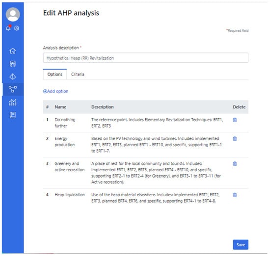 The case described in this paper is related to the SUMAD project (Sustainable Use of Mining Waste Dumps) []. The foundation of the SUMAD methodology is included in the paper []. This paper discusses MCDM, especially AHP applications in the revitalization of different degraded areas [,]. Some analogies to the SUMAD methodology are observed, but none of these papers present the holistic approach embracing the identification of the AHP criteria and options based on detailed analyses of domain data—there are only general risk issues in some of these papers. The SUMAD methodology works out iteratively a certain number of revitalization alternatives (here: options) free of unacceptable risks, with acceptable financial parameters and non-financial parameters (social, political, legal, etc.) provided to the decision-makers, who make their decisions manually.
