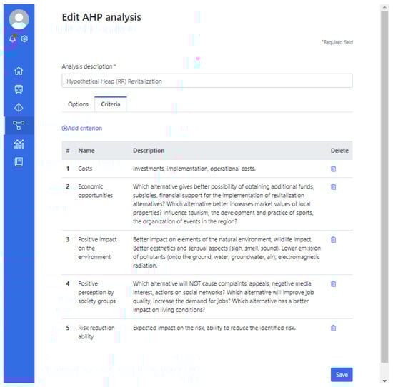 The decision-maker selects manually the target revitalization alternative considering results of theses analyses. It is possible to modify alternatives when their parameters obtained from analyses are unsatisfied. The modified alternatives are analyzed again. Revitalization alternatives are worked out iteratively, until the set of alternatives is reasonable for the decision-maker. The case concerns the idea to enhance the manual SUMAD decision process by supplementing it using the AHP. Revitalization alternatives from the SUMAD process play the roles of the AHP options. The AHP criteria should be elaborated using the analyses results, especially aggregated information from analyses. The case presents how to elaborate the decision criteria for the AHP and to assess/modify options (here: alternatives) before using them in the AHP. Decisions are focused on the concrete object—a heap. The deeper the knowledge related to the decision object is acquired, the more adequate a decision could be obtained.