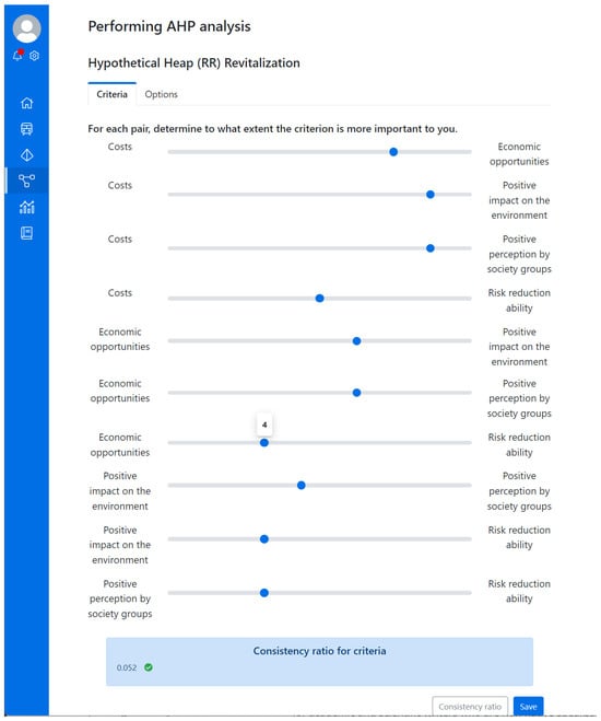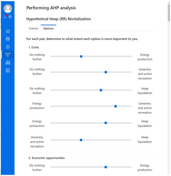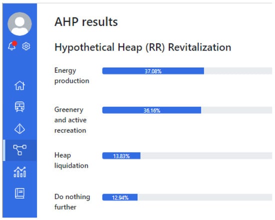 The AHP tool provides assessment results. Figure 11 shows partial results after local and government representative voting. At this stage of the decision process, the most preferable by the decision-makers team is the alternative RVA[3] “Active recreation”. Very close to it is RVA[4] “Heap liquidation by the use of the heap material elsewhere”.