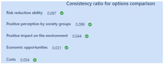 The decision-makers should watch the consistency indexes (Figure 10) for whether they are smaller than 0.1. When an index is too high, the decision-maker is warned and makes his/her assessment more consistent. After setting the importance criteria, the decision-making team member starts an exhaustive process of mutual comparisons of options. Going from one criterion to another, the mutual comparison of options is performed.