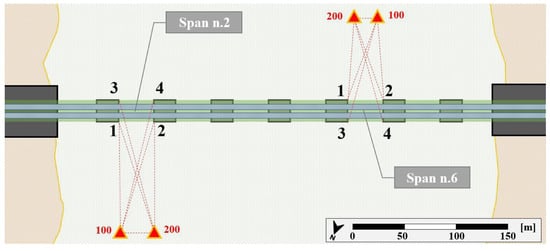 Regarding the design of the topographical network, the installation of four prisms was planned, two for each span, as shown in