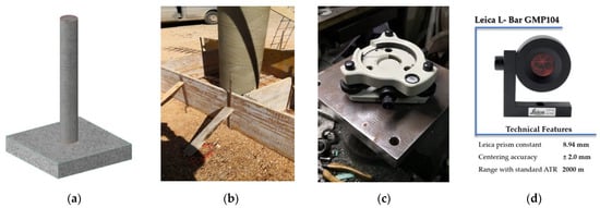 Furthermore, the materialisation of the points to be measured and the station vertices is as such to allow the correct interpretation of the structure’s behaviour in terms of three-dimensional displacements. The materialisation of points includes all those construction operations that allow the various topographical operations to be carried out accurately: pillars for the materialisation of station vertices and the installation of mini prisms on the points to be monitored. For each vertex, it was decided to build a foundation with a square base (1 m × 1 m base and 0.20 m height); a pillar with a circular cross-section (0.20 m diameter, 1.60 m height) was realised on this type of foundation (