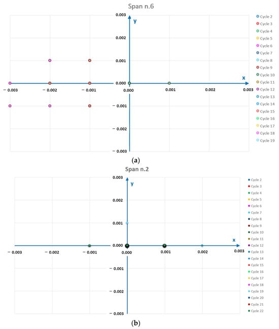 Figure 6, it was found that the differences between the different measurement cycles are in the order of a few millimetres. In fact, for span no. 2, 60% of the measurements are below one millimetre, and 40% show a difference of between 1 and 2 mm. On the other hand, for span no. 6, 23% of the measurements are below one millimetre, 36% show a difference of between 1 and 2 mm, 31% show a difference of between 2 and 3 mm, and the remaining 10% show values of more than 3 mm but less than 4 mm. As far as the reliability of the measurements is concerned, for an a priori estimate of the mean and the variance, respectively, equal to