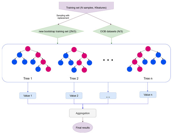 Ensemble learning techniques include the random forest algorithm. When dealing with data that have a lot of dimensions, it works well. In order to reduce the risk of model overfitting and increase overall accuracy, it builds many decision trees during training and then merges their classification outputs [86]. For the purpose of generating new training datasets, the random forest model uses a combination of random sampling and replacement. This method of random sampling reduces the impact of individual samples while increasing the model’s variety and resilience. The decision trees are constructed using the random forest model using a feature-random-selection approach. In order to choose candidates, split attributes at each decision tree node, a subset of the whole feature set is randomly selected. (see Figure 5). The model’s capacity to generalize is enhanced by reducing feature correlation via feature random selection. Last but not least, the random forest model uses voting to decide on classifications. Each decision tree makes a forecast for a classification job and the ultimate outcome is decided by a majority vote. The vote result may be written as follows, assuming the collection of classes is and represents the result of prediction of the decision tree hi for class ci.