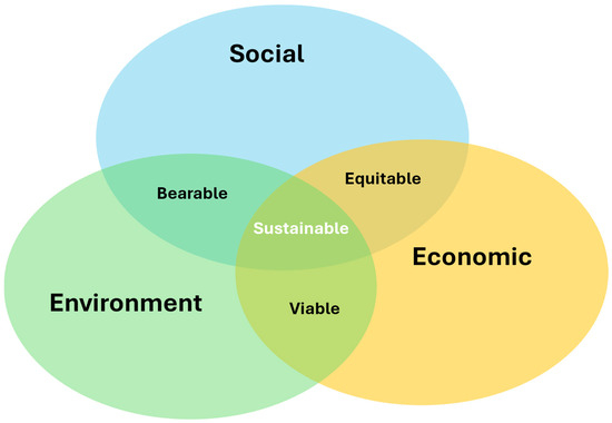 The term ‘sustainability’ refers to utilizing the Earth’s resources to meet the demands of the present generation without compromising the needs of future generations. This concept is closely associated with the 21st-century Millennium Development Goals (MDG) [34]. When discussing the transportation sector, particularly pavements, environmental sustainability means considering the effects on the environment, economics, and society at every stage, including material choice, design, construction, and preservation methods. Pavement sustainability, in essence, encompasses the triptych, commonly known as the triple bottom line, which has distinct sides [6]. The three key factors are the environment, economics, and society. Figure 1 illustrates the triple bottom line of environmental sustainability.
