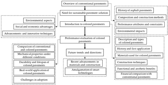 The scope of this study covers an evaluation of the characteristics, efficiency, and effectiveness of conventional asphalt pavements, along with an in-depth examination of several sustainable materials and methods used in colored pavements. The experimental method of this review paper is illustrated in Figure 2, which shows the detailed layout. This paper will address current progress in the field of pavement material science, including the integration of recycled materials and the application of photoreactive and reflective coatings. Furthermore, it will focus on the impact of colored pavements on urban climates, traffic safety, and energy consumption. It comprises various case studies and research findings from different regions to offer a comprehensive perspective on advancements in paving solutions. This study proposes significant insights for researchers, policymakers, and practitioners on the subject of sustainable infrastructure development by analyzing the existing literature and highlighting specific areas.