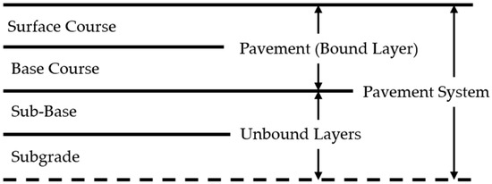 Approximately 95% of the world’s road infrastructure comprises flexible pavements [56]. The composition of the structure consists of four distinct layers, subgrade, subbase, base, and surface course [12,57], as illustrated in Figure 3.
