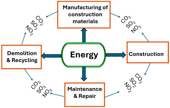 Sustainable development implies a balance between economic and social development and environmental protection, i.e., between human activities and the natural world. Thus, as the perception of the world’s limited resources (minerals, fossil fuels, etc.) increases, the search for solutions to reduce their dependence is intensified. Installation activities, particularly road pavements, have a substantial environmental impact. Construction activity directly impacts the environment by consuming energy and natural resources and releasing gaseous emissions into the atmosphere. Nevertheless, the impact on the environment persists throughout the lifespan of the infrastructure, intensifying during specific activities, such as maintenance, refurbishment, and demolition [175].