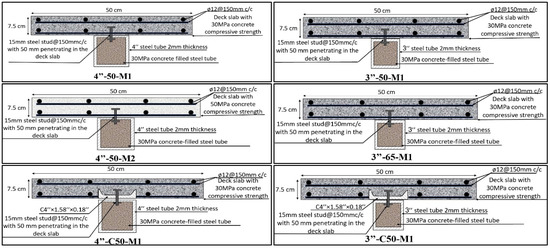 In this study, two main materials were used: concrete and steel. Two types of concrete were utilized: normal-strength concrete with a target compressive strength of 30 MPa that was used to fill the steel tube and some deck slabs, and high-strength concrete with a target compressive strength of 50 MPa that was used for one of the concrete deck slabs. Table 1 shows the details of the specimens. Steel rebar with a diameter of 12 mm was used as the main reinforcement for the slab deck with 150 mm c/c spacing, where the yielding and ultimate strength of the rebar were 450 MPa and 550 MPa, respectively. Steel bolts work as shear studs with a diameter of 15mm and spacing of 150 mm c/c were used to connect the concrete deck with CFST. Steel tubes of 2 mm thickness were used with dimensions of 3 inches (75 mm) and 4 inches (100 mm). Specimens 3″-C50-M1 and 4″-C50-M1 were integrated with channel section of C4″ × 1.58″ × 0.18″ to stiffen the joint section between the CFST and the deck slab, as shown in Figure 1. The composite beams of 1.8 m total length and 1.7 m flexural span length were prepared to be tested under a four-point bending load to investigate their flexural behavior.