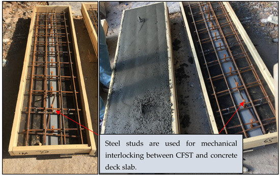 The specimens were prepared in two stages: the CFST was cast first with the steel studs fixed inside them at the designed spacing of 150 mm c/c and length of either 50 mm or 65 mm to be embedded inside the concrete deck slab. The concrete deck wooden mold and reinforcement were fabricated and erected over the CFST, Figure 2.