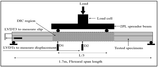 The specimens were prepared to be tested in a four-point load test setup, as shown in Figure 3, with a loading rate of 4 kN/min. The flexural span length of the beam is 1.7 m, where the two-point load is divided into three parts. Three linear variable differential transducers LVDTs were utilized; the first one (D1) was placed under one of the point loads, and the second one (D2) was placed in the middle. These two were used to measure the vertical displacement, and the third one, LVDT3, was placed at the edge of the beam to record the slippage between the CFST and the concrete deck, where the LVDT3 mounted on the CFST, and the tip was projected on a steel plate that was mounted on the deck slab so that the relative horizontal displacement can be recorded. The load was recorded via the load cell, where the displacement versus load and slippage versus the load curves can be obtained, as will be shown later. The test setup was using the DIC measuring technique. The middle of the specimens was painted with random dot patterns, and a high-quality camera with a 24 MP sensor was used to take pictures at specific intervals (every 1 s). Then, images can be used in the GOMTM 2019 DIC software to extract the strain along the test.