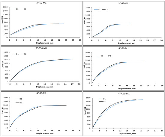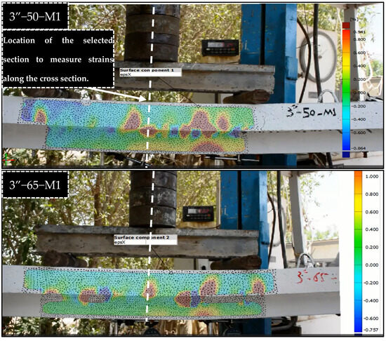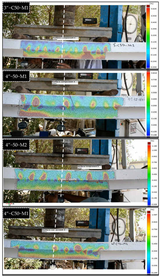 As shown in Figure 4, the readings at the beginning, failure phase of both LVDTS, D1, and D2 are almost the same, and they have some difference in the middle of the load–displacement response, this indicates that the bond between the CFST and the concrete deck slab is sufficient since the difference in the middle due to the sagging behavior of the composite beam. Finally, when the beam reaches close to the ultimate stage, the difference between the values of points D1 and D2 becomes the largest. While points D1 and D2 appear to have similar values on the graph at this stage, this is solely due to the beams having the same ultimate strength. This shared ultimate strength, observed at high deflection steps, causes their load–displacement curves to converge in the Y-direction, creating the illusion of convergence. As a remarkable point, the main attribute of the enhanced flexural behavior of the composite section is the innovative method used to fix the shear studs that connected the CFST and the deck slab. These studs were fixed inside the tube before casting the concrete by making a hole in the top of the steel tube and tightening employing the nut, then casting the concrete materials and also enhancing the bond of the studs with the steel tubes. The shear studs were penetrated inside the concrete deck with different lengths of 50 mm and 65 mm at 150 mm spacing. Specimens 3″-C50-M1 and 4″-C50-M1 were supplied with channel C4″ × 1.58″ × 0.18″ at the junction between the CFST and the concrete deck. These specimens showed the best performance in terms of flexural strength and bond mechanism, where the channel enhanced the bond mechanism between the CFST and the concrete deck. This hypothesis was confirmed by the observation of the DIC measurements, where no slip was detected at the specimens enhanced with channel sections.