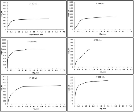 Figure 5. Load–slip curves of the tested specimens, measured from the side of the beam.