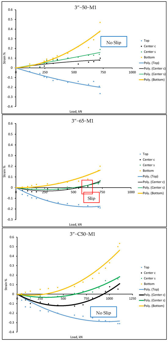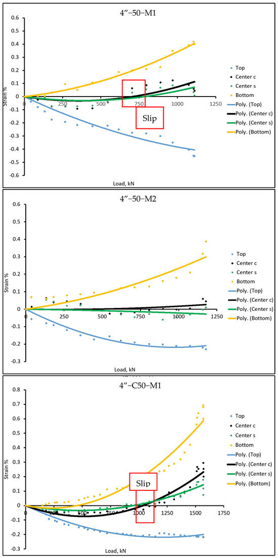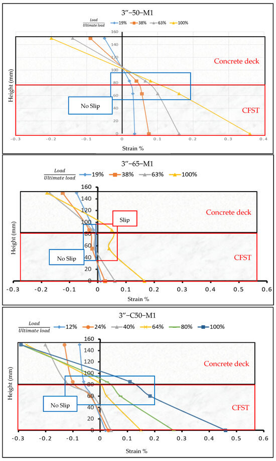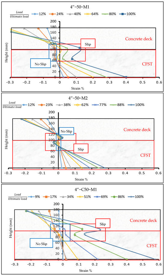 The horizontal strain distribution in the middle of the beams was measured along the composite cross-section as shown in Figure 6, sample (3″-50-M1). Four points are selected to construct the strain profile as follows: top of the slab, bottom of the slab, top of the CFST, and bottom of the CFST. The strain profile for all the samples is demonstrated in Figure 7.